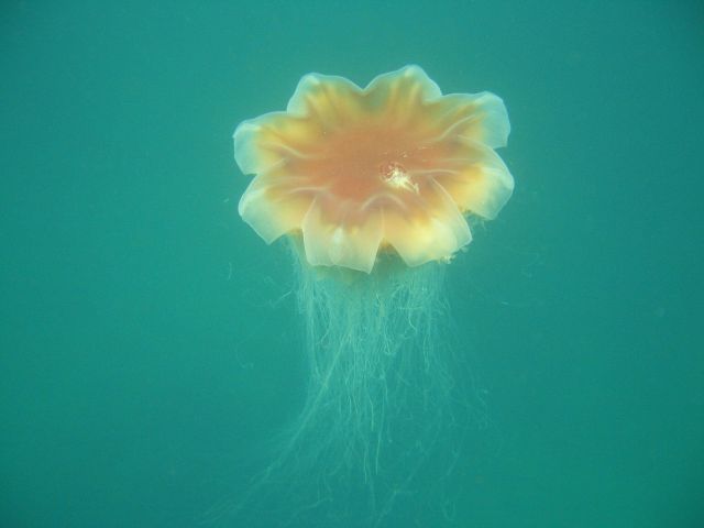 Merisiili kelpissä, halkaisija 10cm. Taskurapu DEFENCE moodilla. Kuvassa saksien väli 15cm.