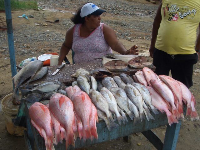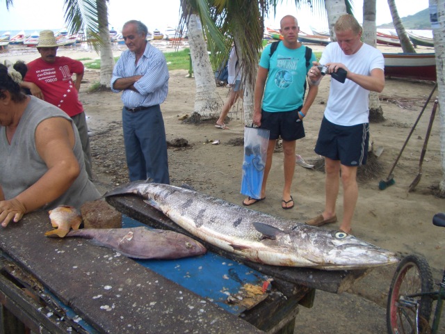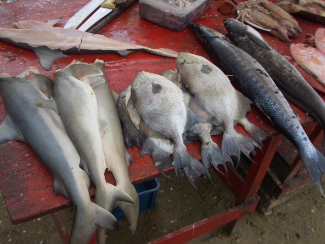 Kalatorilla. Haita, jotain muuta, barracudaa. Kalaa eri väreissä. Noin 10 kiloinen barracuda.