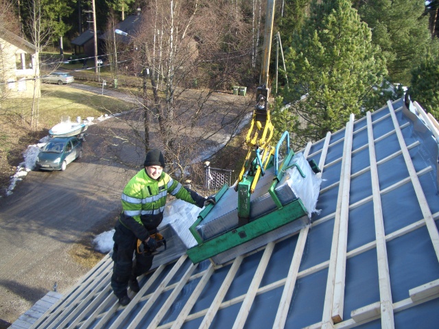 Tuo helpottaa aivan sairaasti urakkaa. (wanhaan tyyliinhän nostot tapahtui 1 lava kerralla katolle, josta 2 jamppaa latelee tiilipinkat ruoteille.