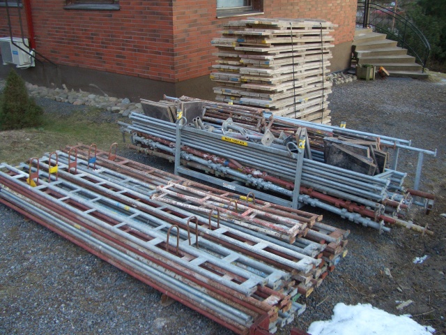 Tiilet purettu, Wanhan ruoteen poistoa. Telineet saapuneet. yhteensä 30m ja korkeuteen 3m mitoitettu, 140 eur/viikko.