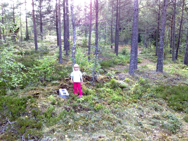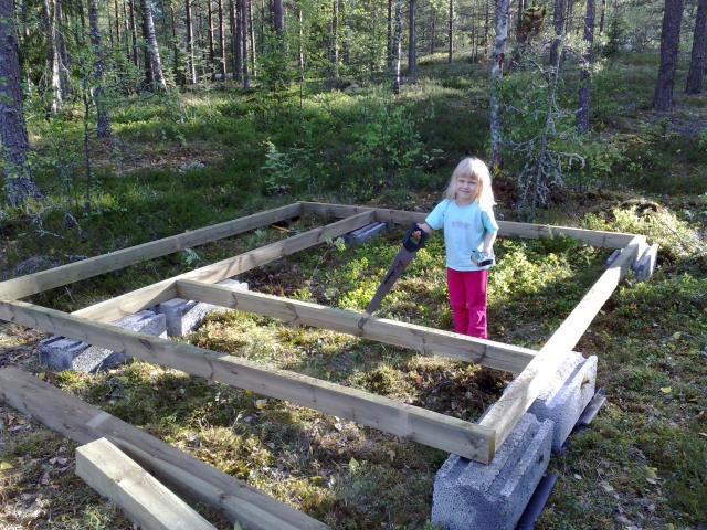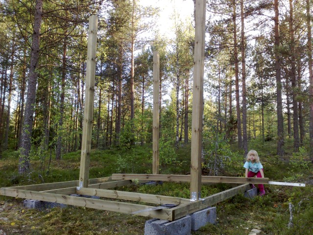 Tähän se tulee, kukkulalle. Pikkuväki avittaa. Maan tasoitus, harkot, 50x100 pattingit. 1.krs lattiapinta-ala n. 10m2. Pystypalkit 100x100, korkeus 3m. ( + katon harja noin 1m).