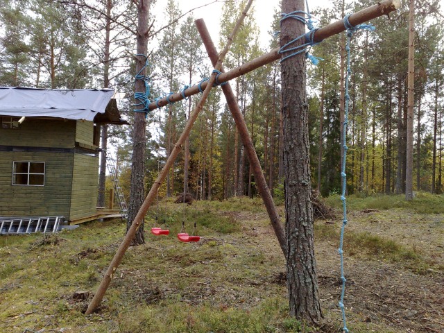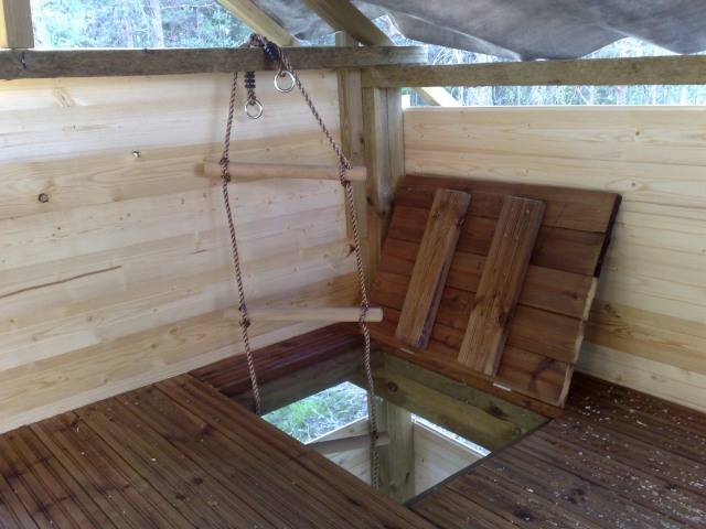 Yläkertaan kipuaminen joko ulkoportaita pitkin tai köysitikkaita käyttäen, Ehkä jokin salaluukkukin jonnekin mökin nurkkaan. katsotaan...