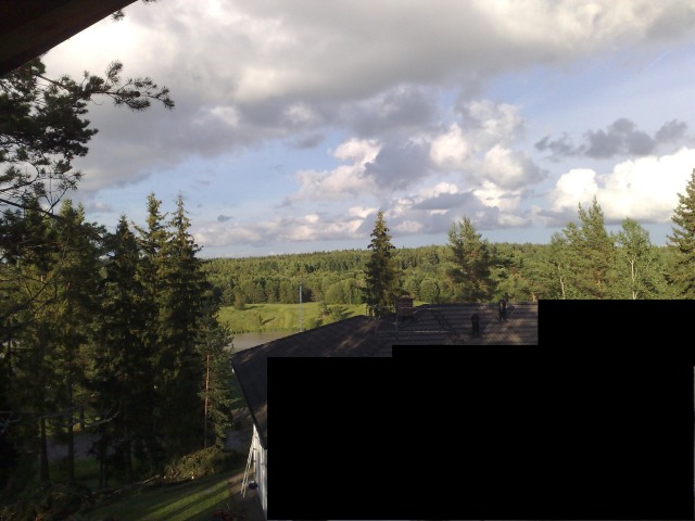 Yläkerrasta näköalaa, järveä, metsän siimeksiä, ym... Mökki maalattuna, ja väliplexit asennettuna. Plexinä on terassikaton aaltoileva plexi. Antaa valon tulla.