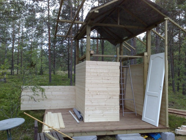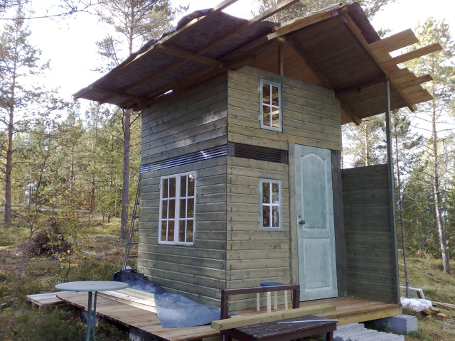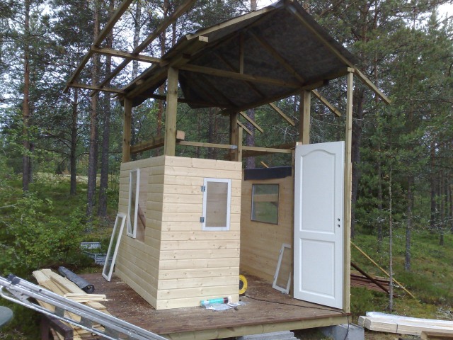 Uritettu terassilankku 1.krs.noin 10m2. Paneelia seinäksi, 28x95. Katto. Katolle aluskatetta, seinäpaneelia, ovia,ikkunoita hommattu. Ikkunoita ja ovi kiinnitetty,
