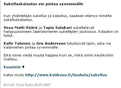 Vesa-Matti Väärä ja Tapio Salakari kävivät 5.7.2007 klo 9:15 Livenä eetteriin turisemassa sukelluskalastuksesta Turun Radiossa.
